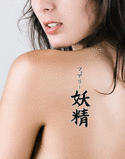 Fairy written vertically in katakana with the meaning "Fairy" written in kanji in a