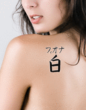 Fiona written horizontally from left to right in katakana with the meaning "White" written in kanji vertically in a