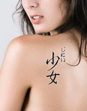 Ginny written vertically in hiragana with the meaning "Maiden" written in kanji in a
