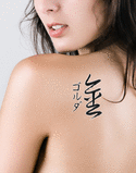 Golda written vertically in katakana with the meaning "Gold" written in kanji vertically in a