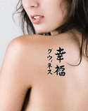 The DOWNLOAD FORMAT Tattoo Design (Adobe PDF ) provides you with everything you need for the perfect Gwyneth With Meaning Happiness Japanese Tattoo. This includes the line art (also called a stencil) that your tattoo artist must have to correctly ink the tattoo.