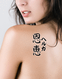 Helga written vertically in katakana with the meaning "Blessed" written in kanji in a