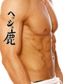 Hesh written vertically in katakana with the meaning "Deer" written in kanji vertically in a