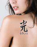 Lucy written horizontally from left to right in hiragana with the meaning "Light" written in kanji vertically in a
