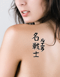 Luella written vertically in katakana with the meaning "Famous Warrior" written in kanji in a
