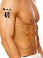 Lupe written horizontally from left to right in katakana with the meaning "Wolf" written in kanji vertically in a