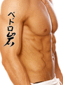 Pedro written vertically in katakana with the meaning "Rock" written in kanji vertically in a