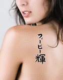 Phebe written vertically in katakana with the meaning "Bright" written in kanji vertically in a