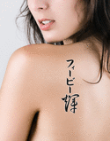 Phoebe written vertically in katakana with the meaning "Bright" written in kanji vertically in a