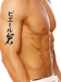 Pierre written vertically in katakana with the meaning "Rock" written in kanji vertically in a