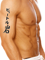 Piotr written vertically in katakana with the meaning "Rock" written in kanji vertically in a