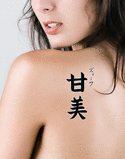 Zisa written vertically in katakana with the meaning " Sweet " written in kanji in a